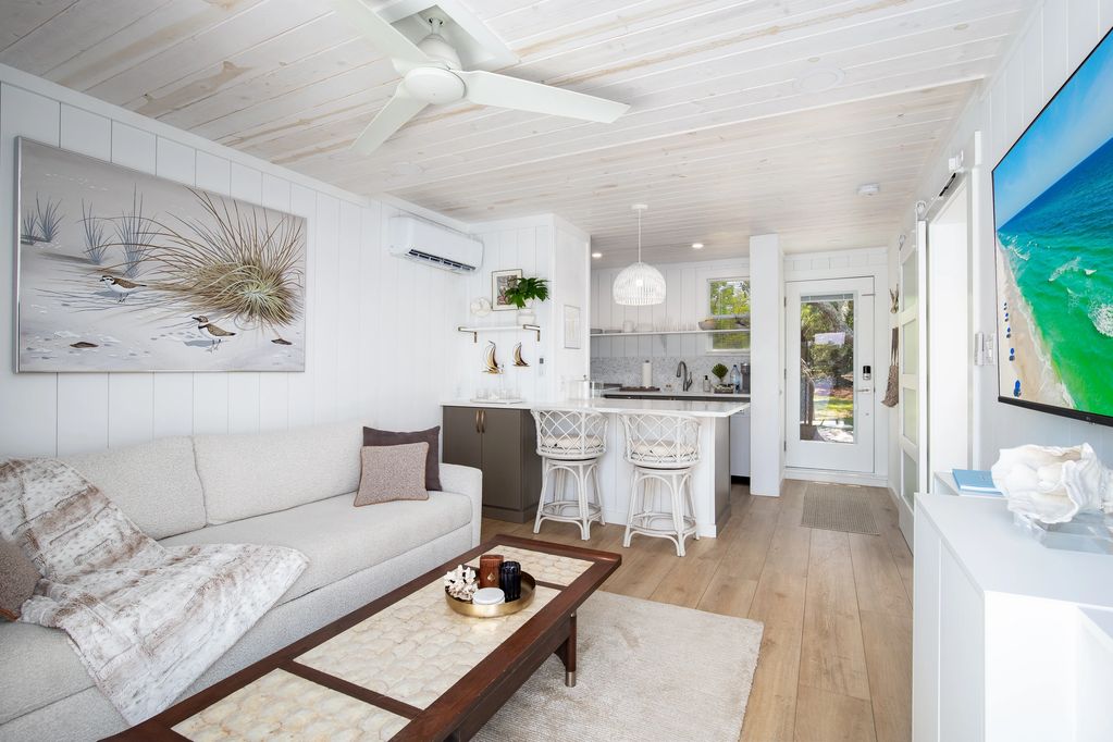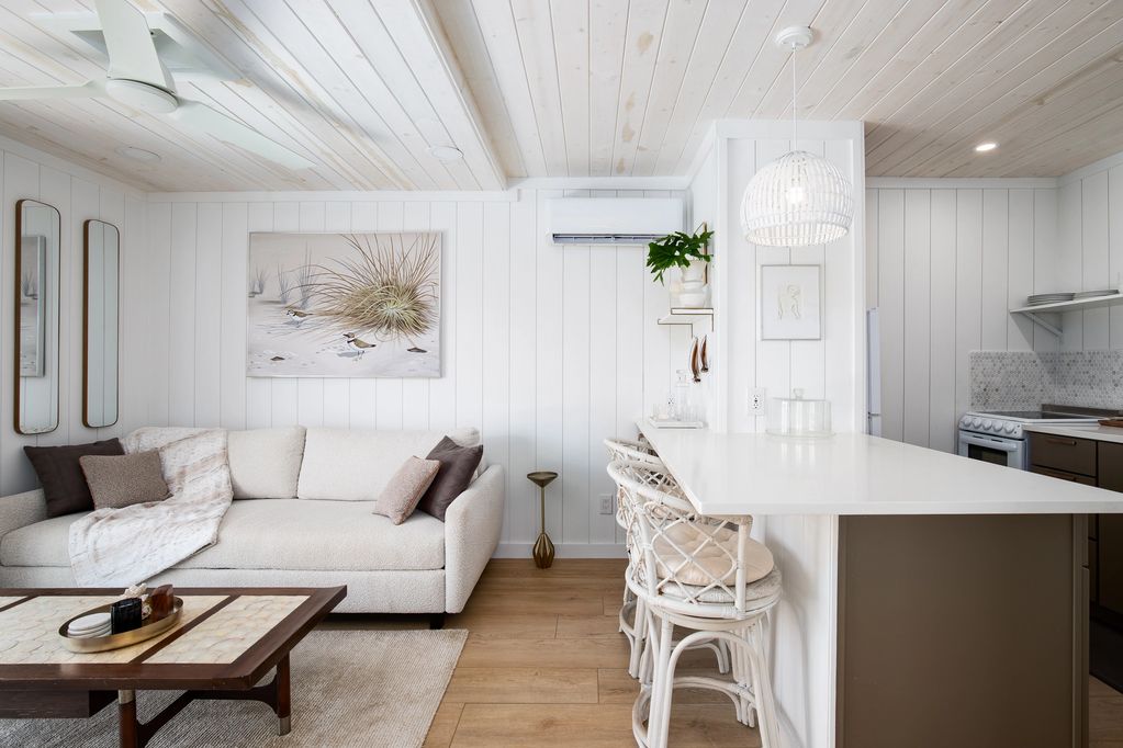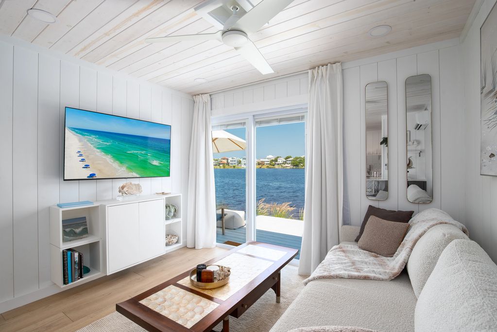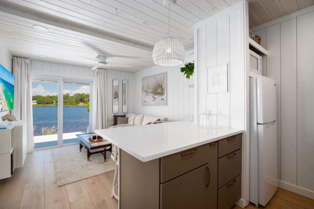 Upon entry the shiplap walls & pinewood ceiling boasts a lake coastal charm. The space is opened directly to lake views through a glass sliding door.