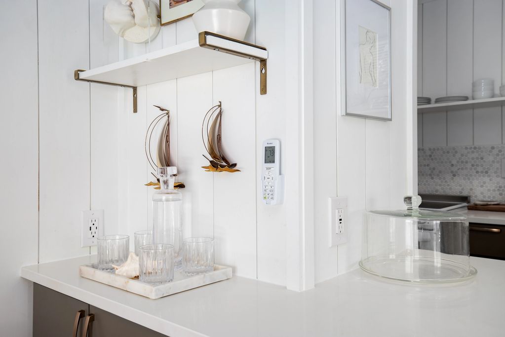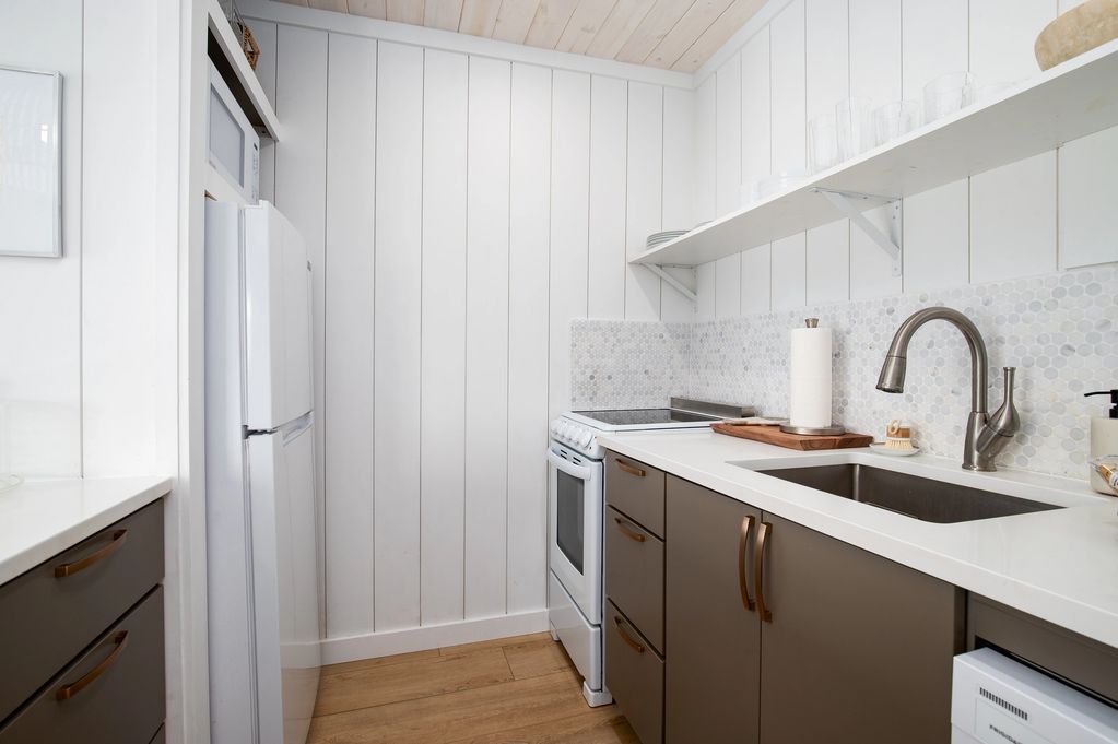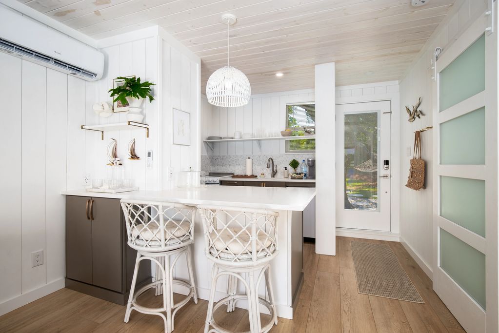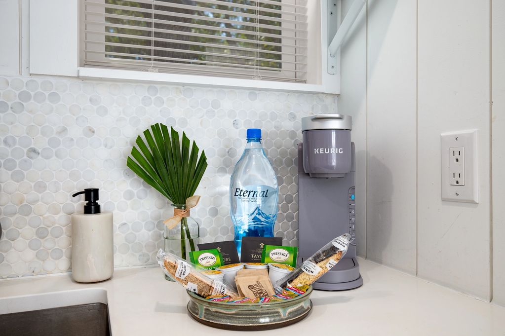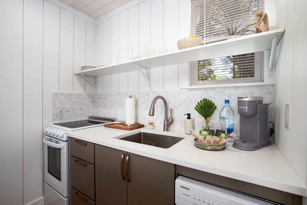 The quaint fully stocked & equipped kitchen overlooks the living area over the quartz dining counter. Two bar stools allow for comfortable inside dining. A mini stove/range, refrigerator, dish washer & microwave allows a full array of options during your stay with plenty of storage for your snacks or groceries. From coffee to omelets to pasta, the cooking options are yours.