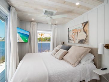 Enjoy an ultra-cozy King size bed w/views of the lake and Gulf. You will feel spoiled with the luxury bedding and pillows, a Nectar memory foam mattress with an ultra-comfortable 2” cooling gel topper! Sleep the morning away w/black out curtains! Complimenting the room is dimmable lights, bedside wall lamps, ceiling fan and a swiveled wall mount smart TV.