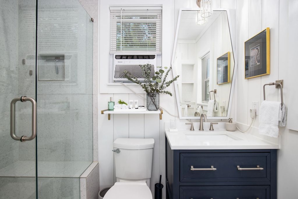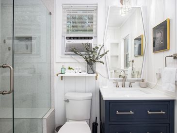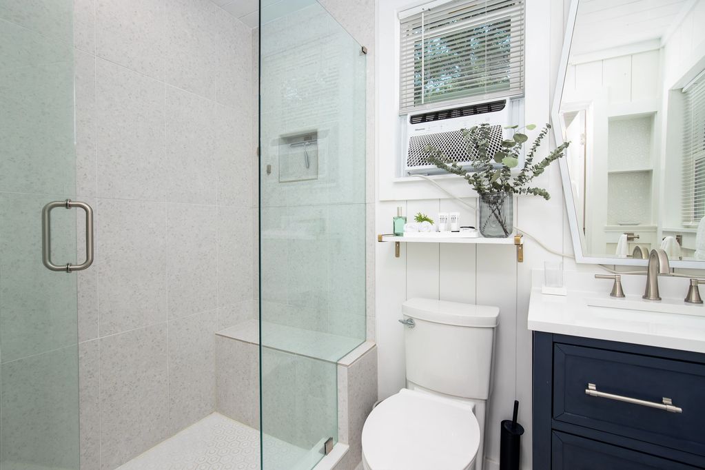 The bathroom invites you into a space just for you. A glass enclosed shower with bench & nook, and five-setting shower head allows for a soothing rinse. A bluetooth speaker light/fan & dimmable shower lighting is for your ambience. Drawers in vanity sink and a shelf wall cubby allows for storage for your personal items. The side window also has a view of the lake and channel.