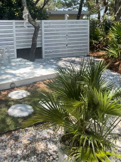 The SIDE deck is private and provides a teak table & chairs with shade umbrella and is surrounded by a natural wall of our favorite Palmettos for a serene and quiet place for a sunset dinner for two.